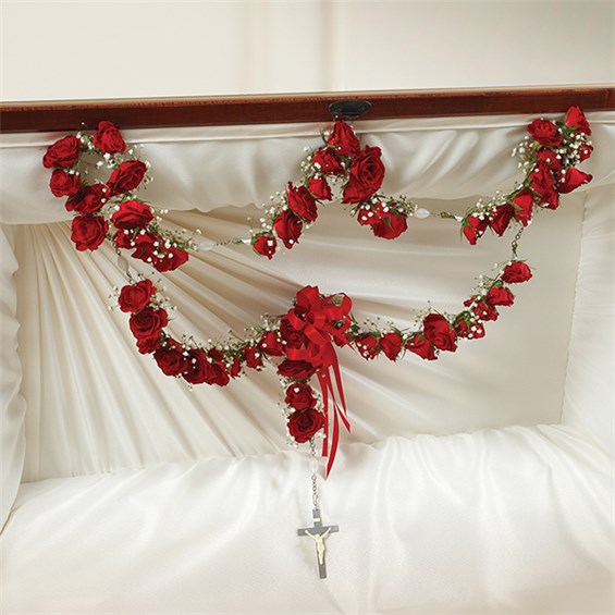 Express the faith, hope and love they inspired with a beautiful ornamental arrangement for the casket. Crafted by our caring florists from a dozen fresh red roses and a string of rosary beads, then accented with baby’s breath and a satin ribbon, this thoughtful adornment is a touching way to celebrate their devotion.